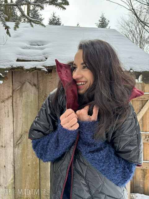 Wdzianko Multifunkcyjne to prawdziwy kameleon w Twojej garderobie - jedno wdzianko, cztery możliwości stylizacji! Noszone normalnie odsłania czarną, wodoodporną pikowaną stronę lub miękkie futerko w kolorze nasyconego wina. Odwrócone do góry nogami tworzy krótszą, dopasowaną sylwetkę z pięknym kołnierzem - na czarną lub bordową stronę.